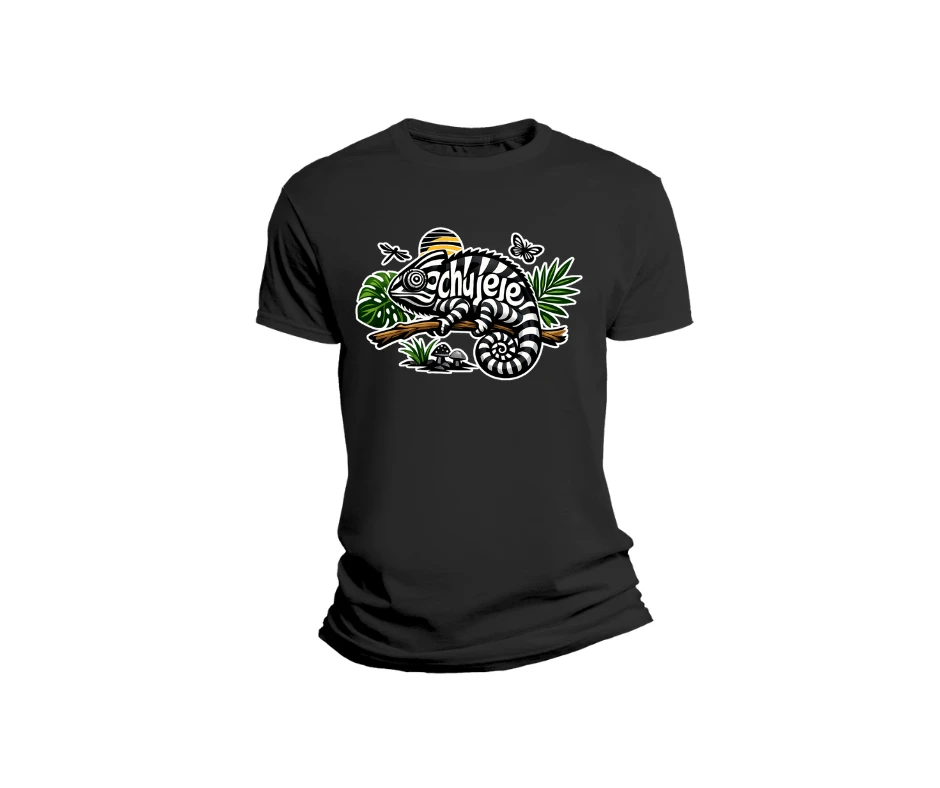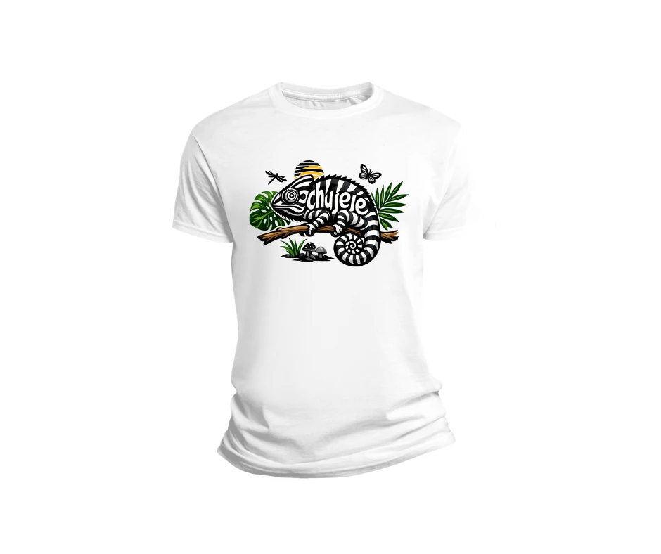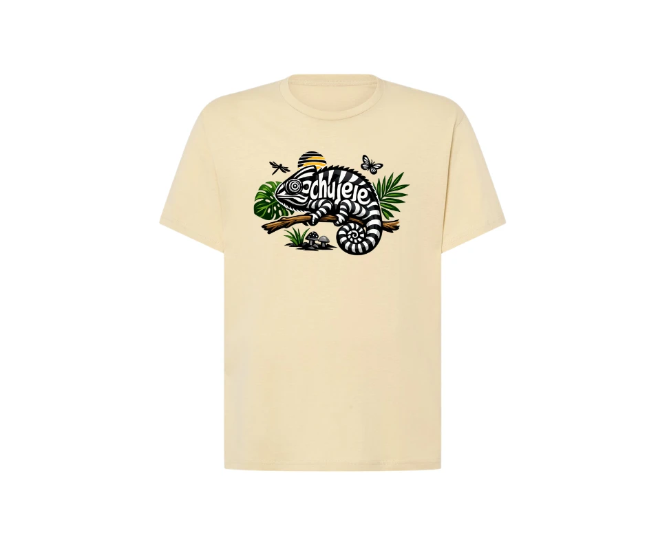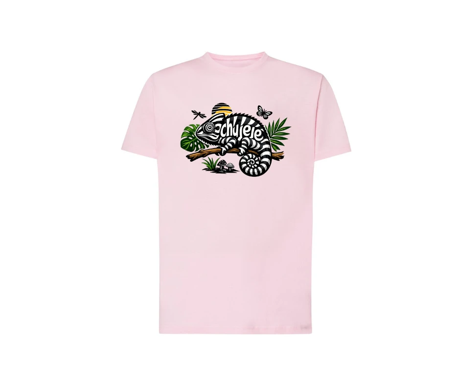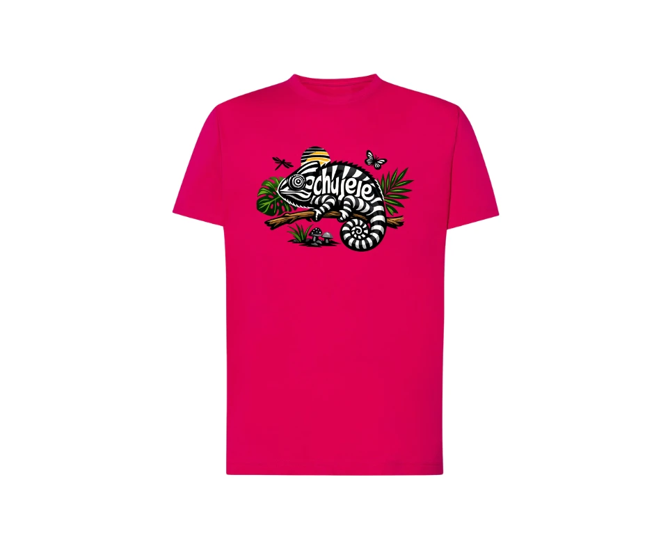 Zabawna koszulka z kameleonem i ukrytym napisem.