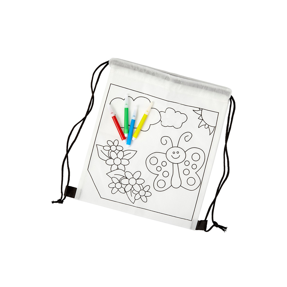 Worek wyposażony jest w zewnętrzną powierzchnię z nadrukiem do kolorowania, która umożliwia personalizację za pomocą dołączonych flamastrów. Nadruk zawiera różnorodne motywy, takie jak kwiaty i motyle.